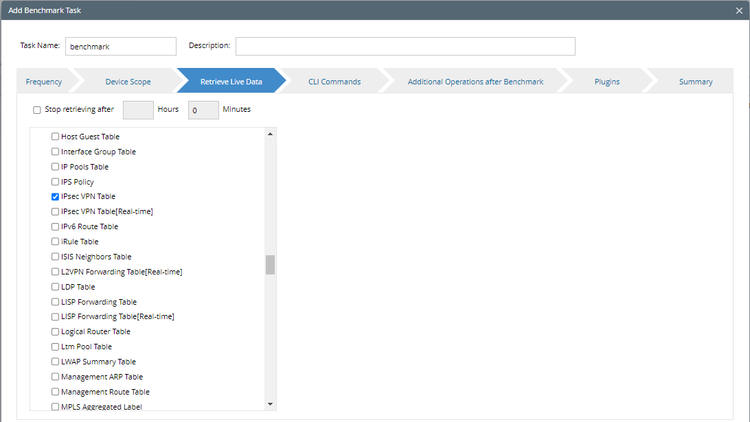 - Go to schedule a Benchmark task, select the NAT Table and IPsec VPN Table options to retrieve the NAT, IPsec VPN and ACL information for path calculation.
