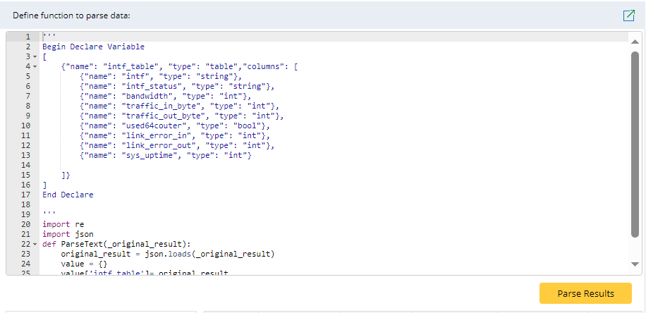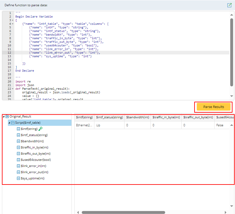 | 2 | def ParseText (original_result) | This function returns the specific metric values and assigns the values to corresponding variables in the variable tree. The following is a sample code of this function: