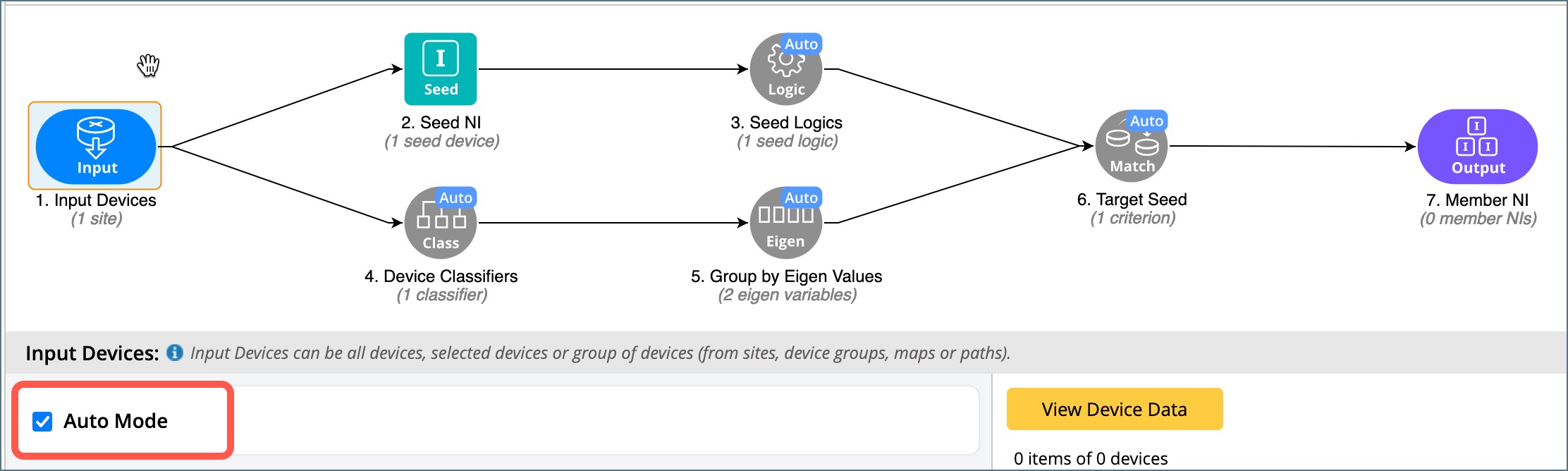 By enabling Auto Mode, you need to define only Input Devices and seed NI. And all other nodes are automatically generated, The only requirement is the Seed NI should not have cross-device diagnosis and macro variables.