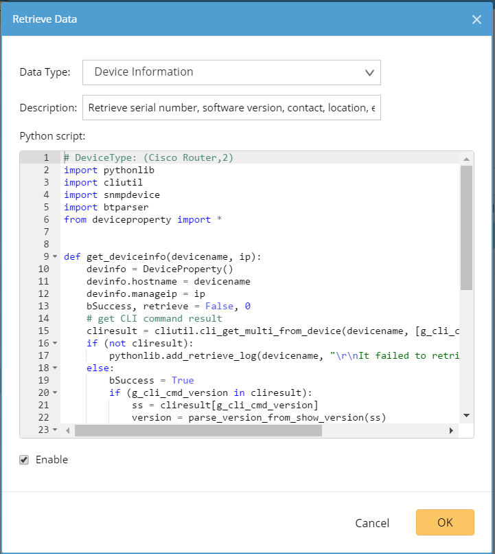 The Advanced tab specifies the python scripts used to retrieve device information (such as serial number and software version) and interface data (such as interface speed and duplex) of the same device type.