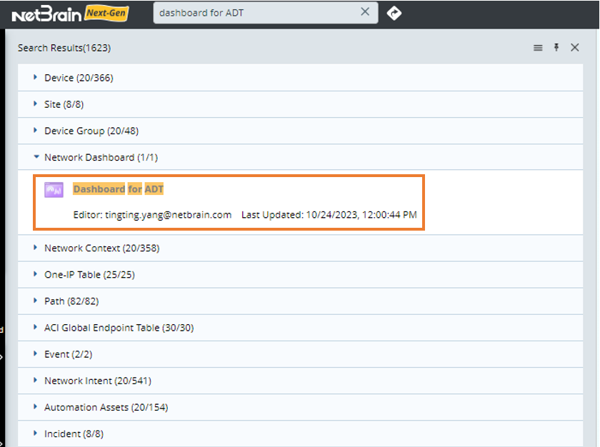 - Press the Enter key on your keyboard to start searching. The search results are displayed under the Network Dashboard group with the matched keyword highlighted.