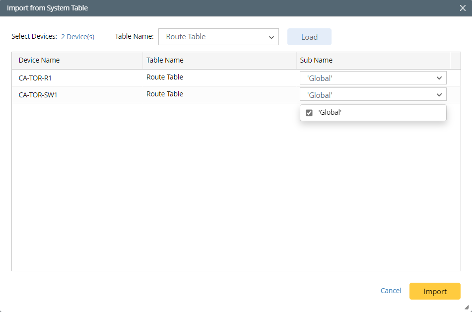 - Select system table from the Table Name drop-down list. Then click Load, the selected system table containing the devices is displayed.