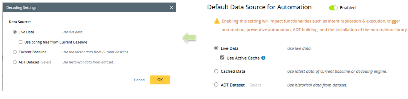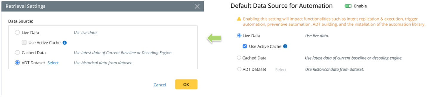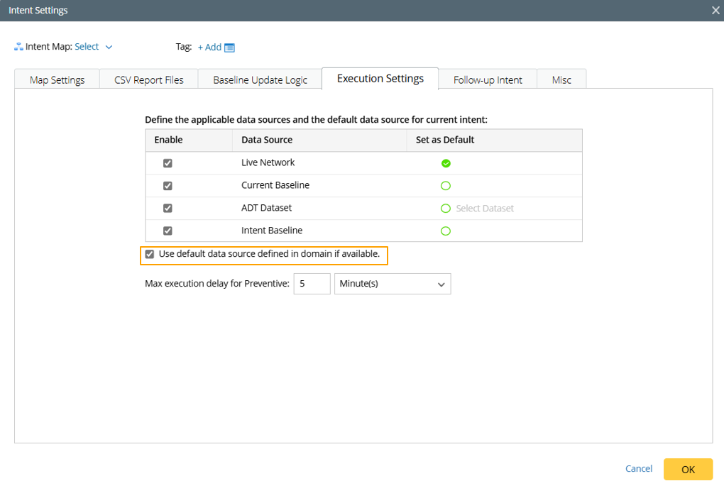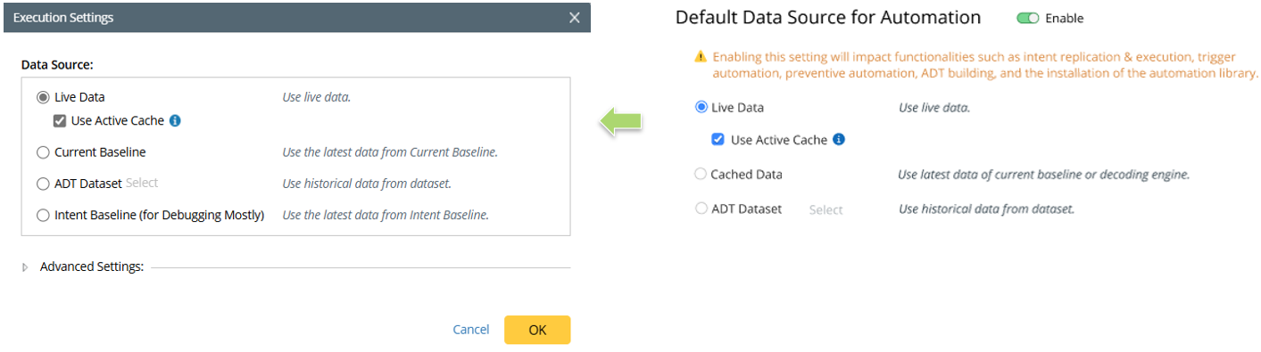 Note: The Current Baseline option in Intent Execution Settings corresponds to the Cached Data option in the domain-level default data source settings. |