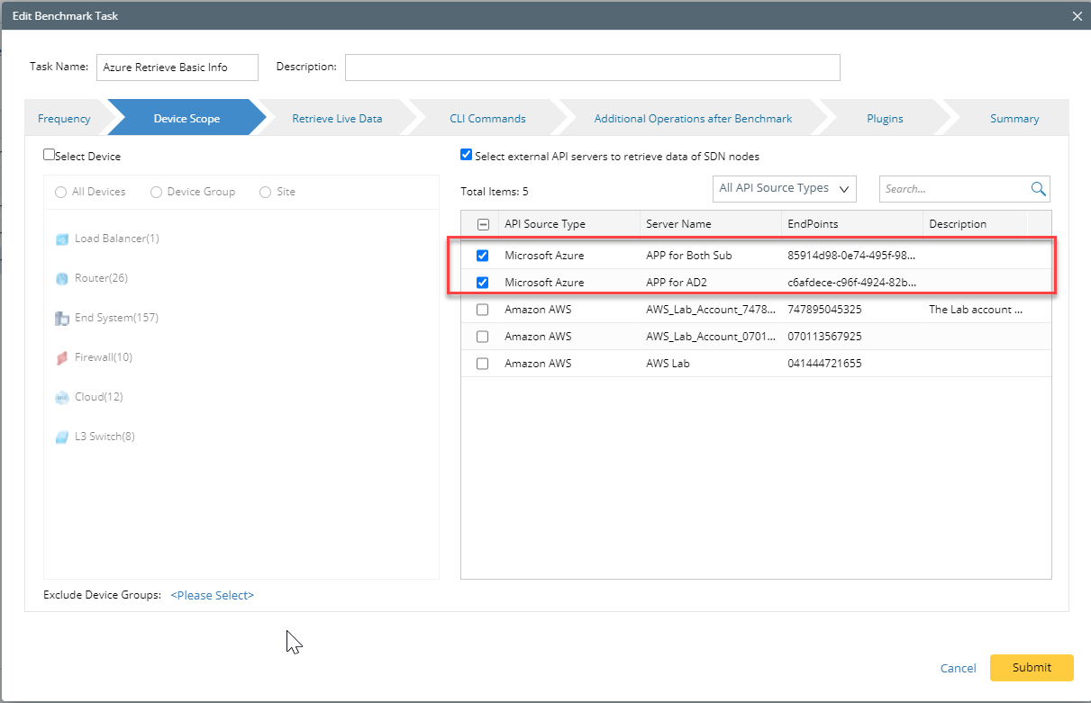- On the Device Scope tab, check the Select external API servers to retrieve data check box and select the API server for Azure.