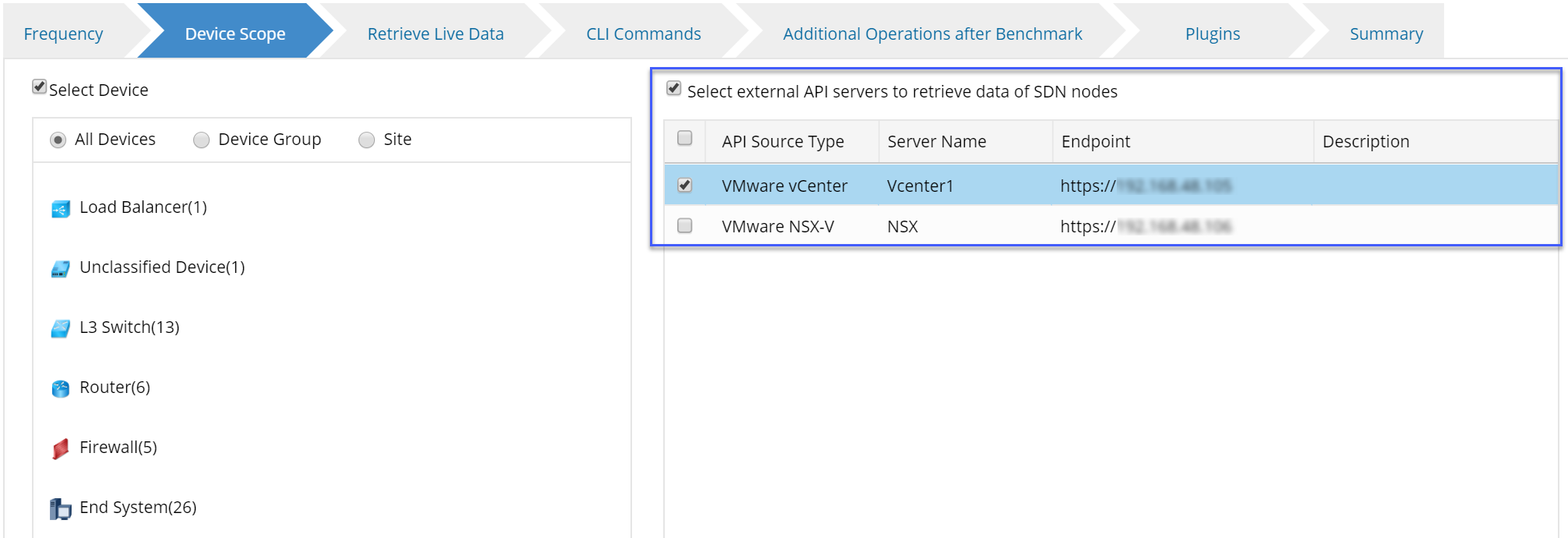 - On the Device Scope tab, check the Select external API servers to retrieve data of SDN nodes check box, and select a vCenter server.