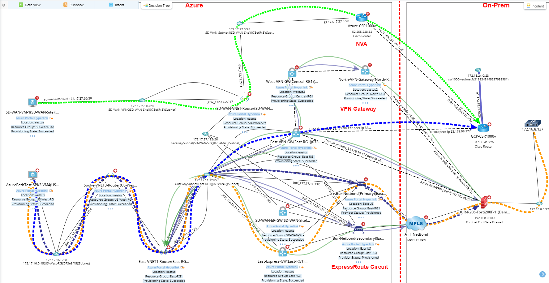 Out-of-box, NetworkBrain enables you to monitor various Azure network data on a dynamic map by using the built-in Data View Template for Azure. This section focuses on explaining how NetworkBrain manages to visualize your Azure data. For how to use Data View Template, refer to Apply Data View Template.