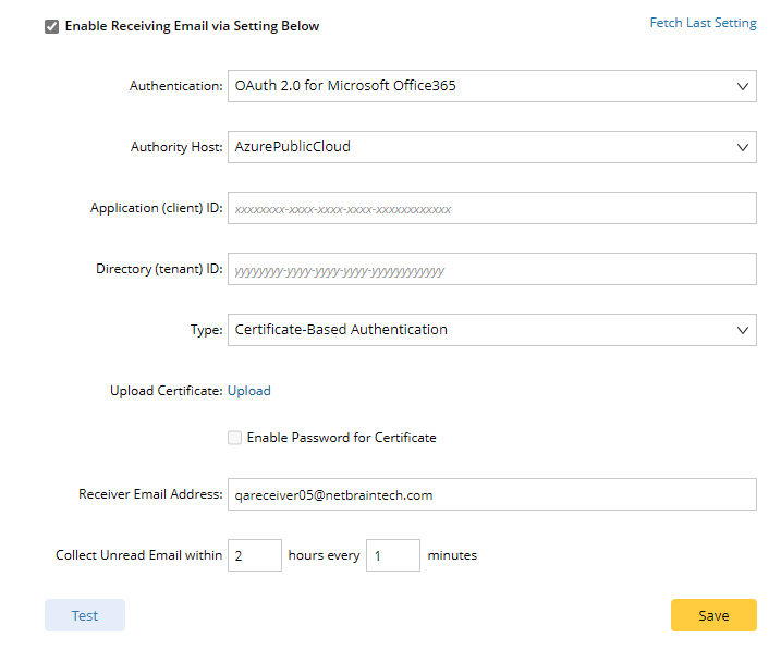There are two ways of authentication, Basic Authentication and OAuth 2.0 for Microsoft Office365, and the incoming email server settings are different for each scenario . Two sets incoming email server settings are respectivley described in the two tables below: