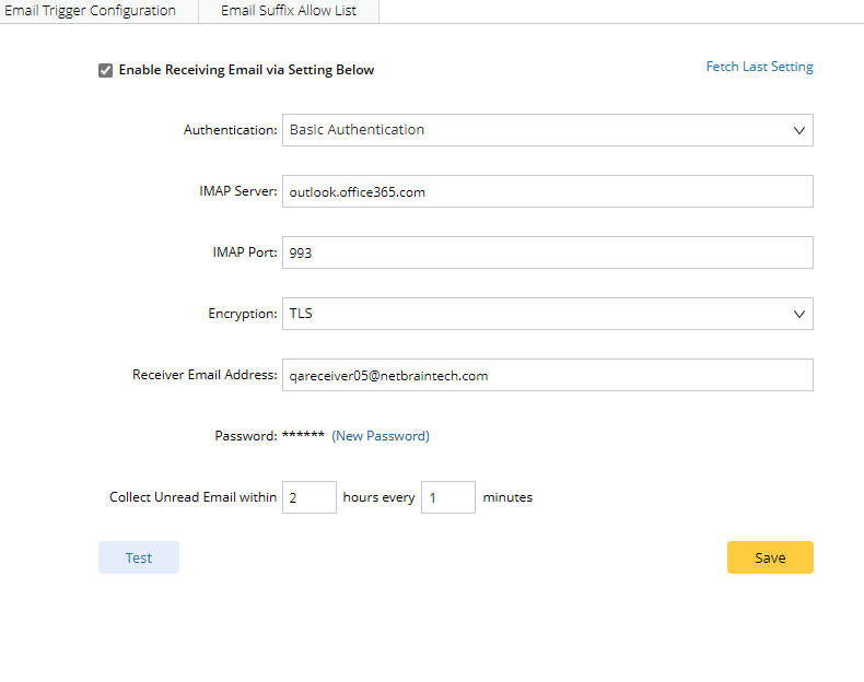 | Collect Unread Email within * hours every * minutes | Define the frequency of collecting unread emails. | 2 hours every 1 minutes |