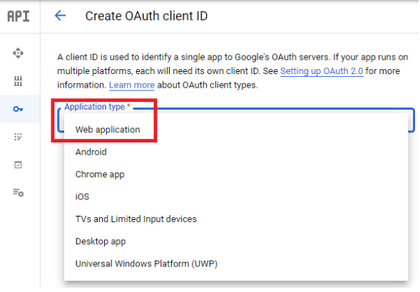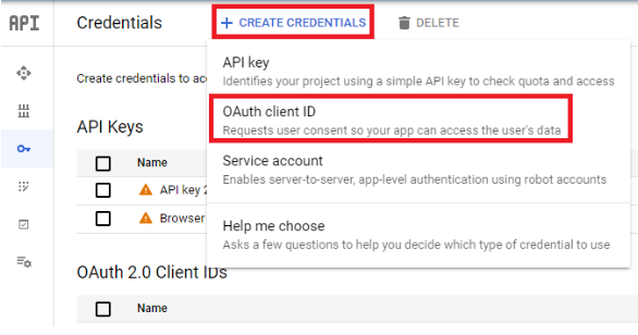 - In the GCP Console, go to APIs & Services Credentials page, click CREATE CREDENTIALS, and select OAuth client ID.