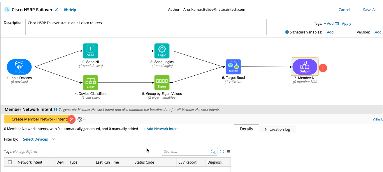 R12.1 JA-2025July15 Creating Member NI Member NI generates member-NIs based on the definition in previous steps. Click Member NI, then click Create Member Network Intent. Defining Target Seed Using Member NI in Network Intent Cluster