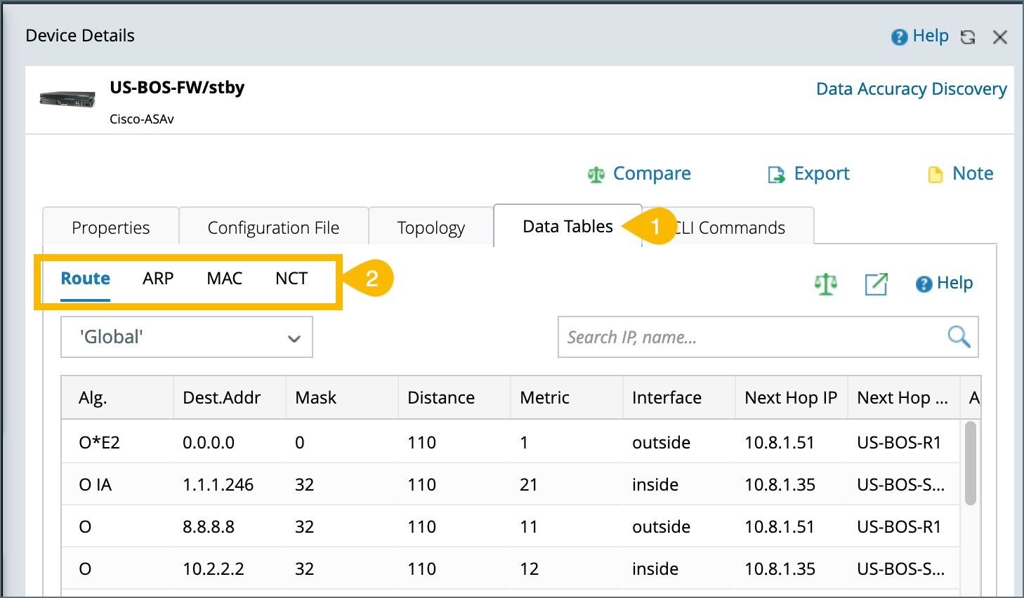 in the Device Details pane to open the Compare window for Data Table.