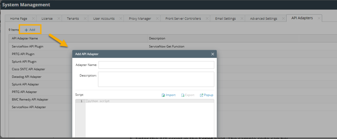 - In the System Management page, select Operations > API Adapters from the quick access toolbar.