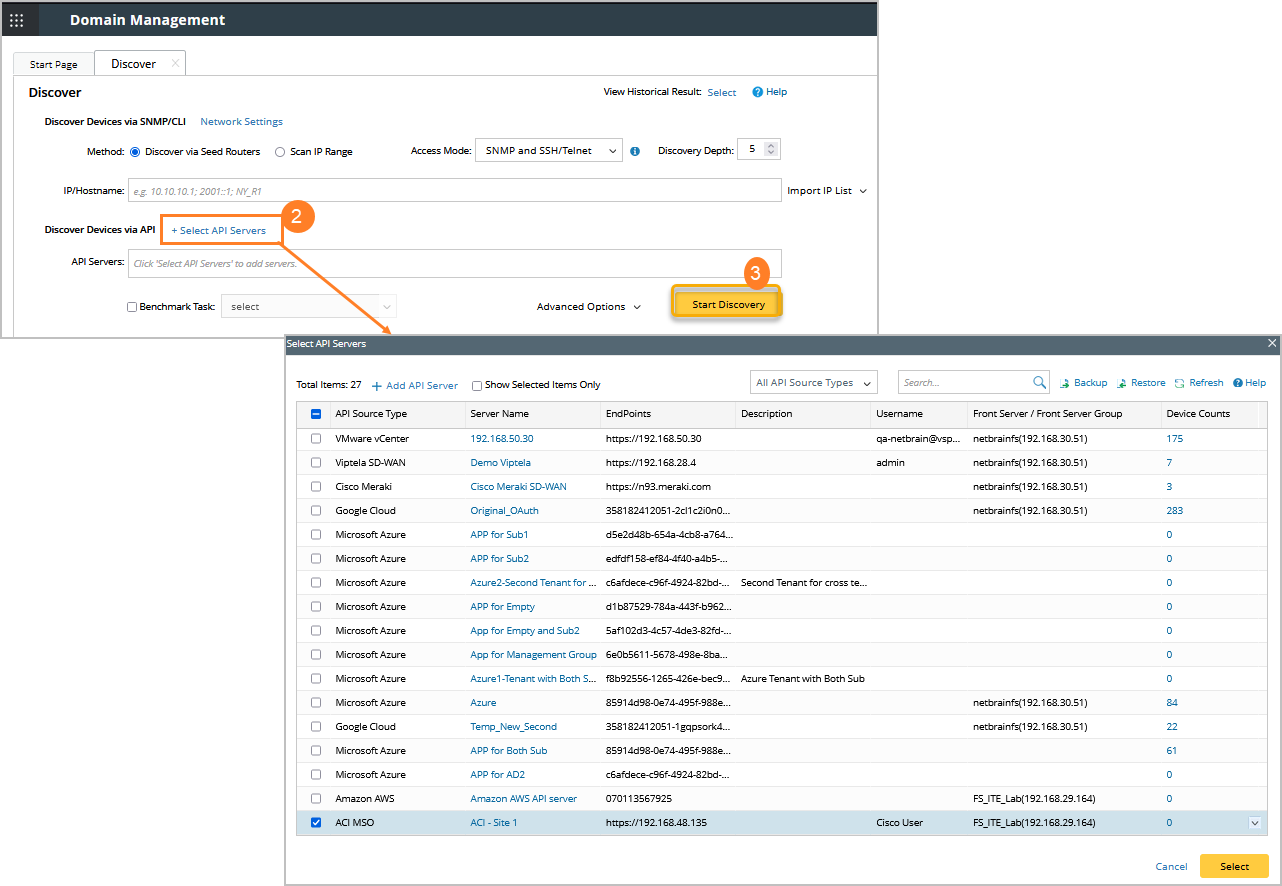 Note: To perform a multi-site discovery, you must select MSO as API Server. Then all sites belonging to the MSO can be auto-discovered by NetworkBrain. - Click Start Discovery.