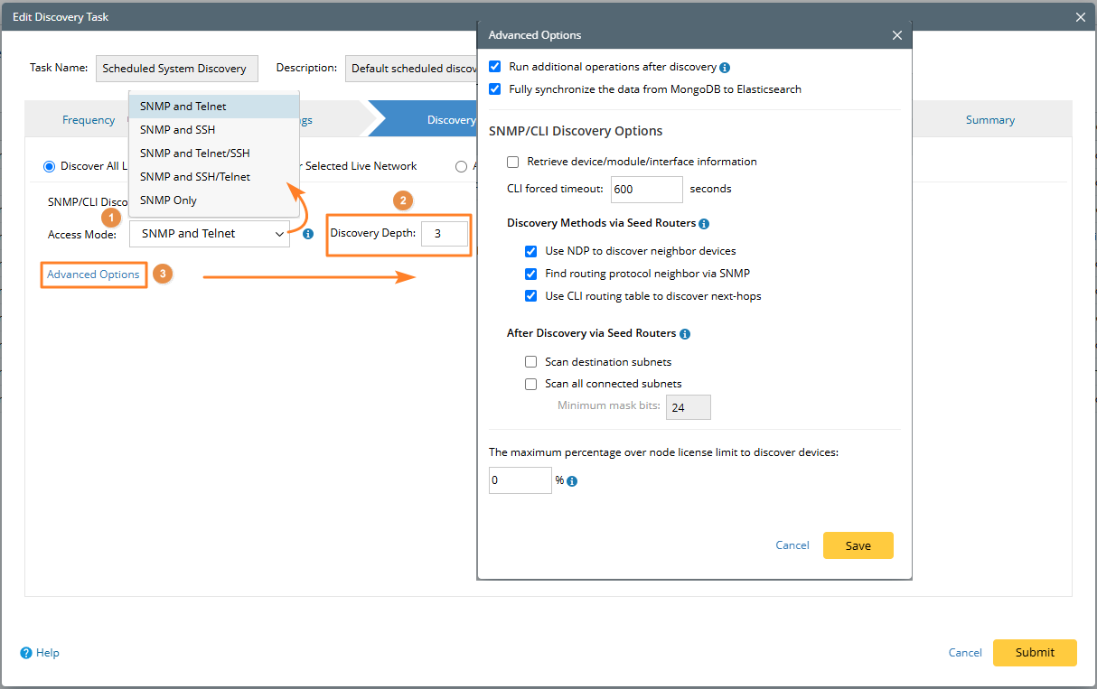 This option takes all traditional devices in the domain as seed devices to discover new devices by neighbor spreading until the discovery depth is reached. It will also rediscover all the SDN/Cloud networks via API.