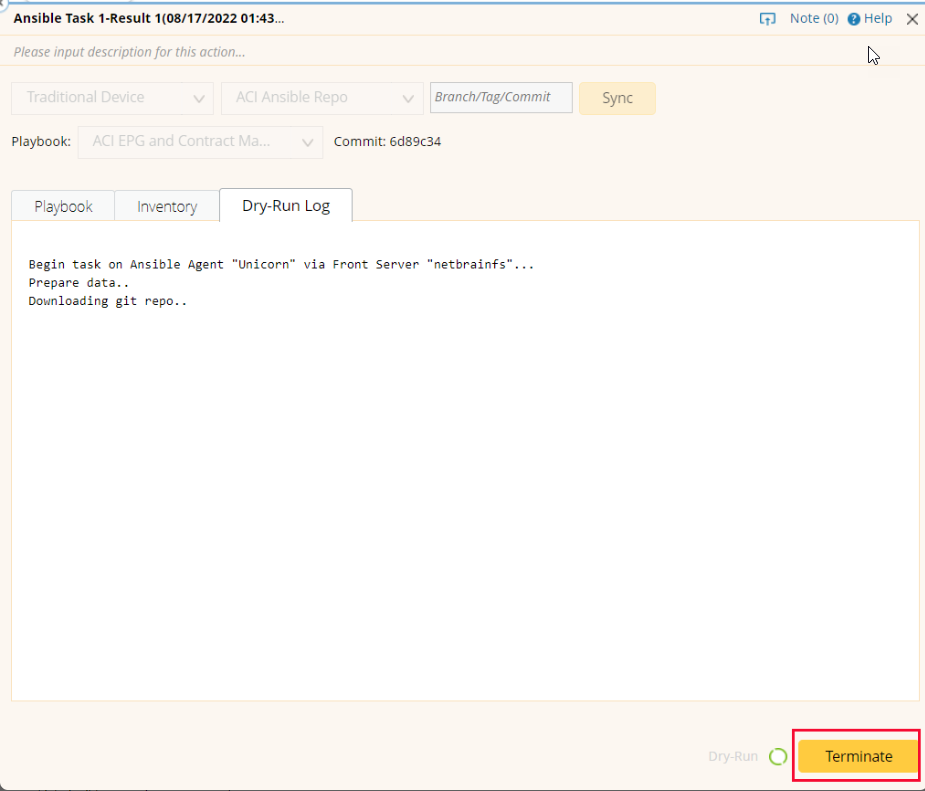 The terminate button can be used to force stop the Ansible task running on the Linux server. However, it is not recommended to perform a force stop unless it’s necessary (such as an un-responding process), as it may cause an unknown system failure.