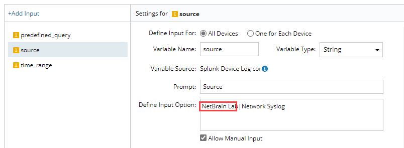 - Select source > Replace NetworkBrain Lab to the actual source name of Splunk network Syslog in Option Values. Keep the pipe ("|") as a delimiter.