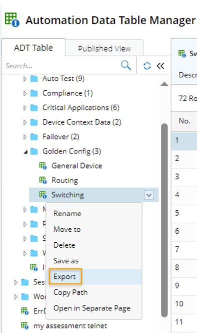Alternatively, you can click Export from the drop-down menu of a target ADT in the Folder Tree of the Automation Data Table Manager to export the ADT.