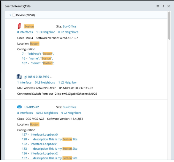 NetworkBrain system supports searching for the Sites by Site name and Device host name.
