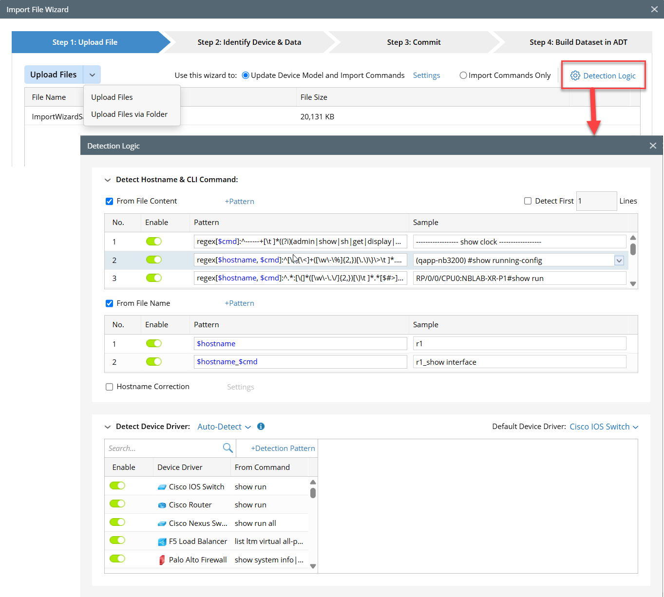 The file can include the output of multiple commands (for example, the output of the CLI command show tech) or the device configurations (for example, the output of the command show run for Cisco devices). The file name can be <hostname>.txt or <hostname>_<command name>.txt. The system can detect the hostname from the file name or the file contents and detect logic defined in the Dtection Logic setting, which you can modify.