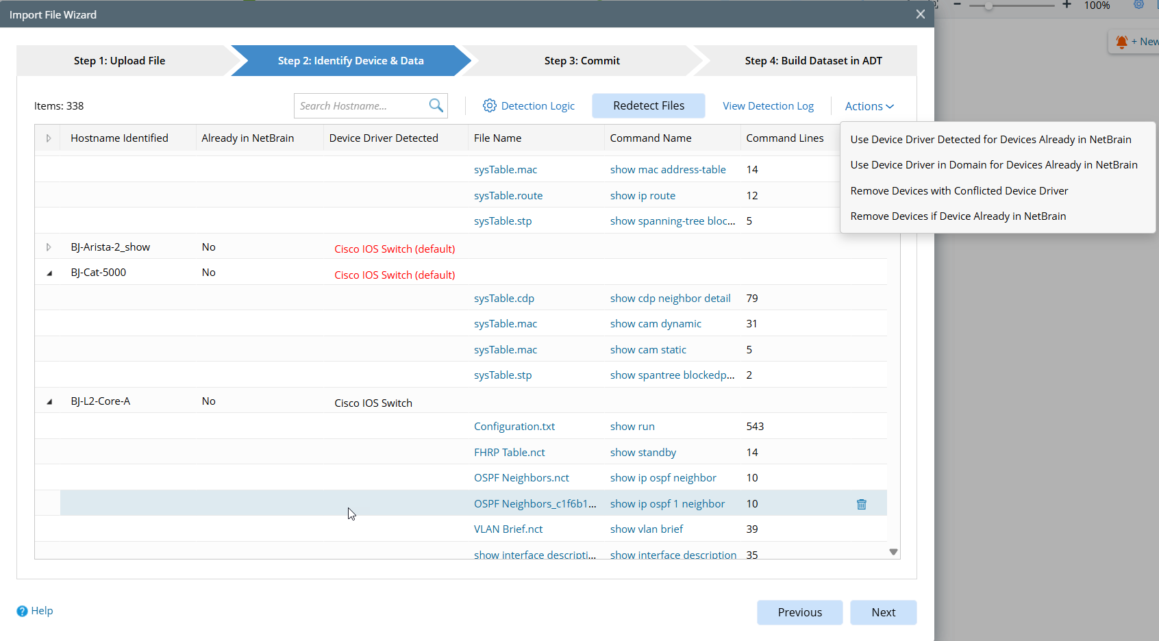 Once you click Next on the Upload File tab (the first step), the parsing starts, and the current tab displays the parsed hostname, file name, command names, and other data for you to review. In this step, you should check whether the hostname is parsed correctly and modify the detection logic if not. Click a command to view its content. You can view the detection log for any error and take action to resolve the issues of the conflict. For example, you can select which device driver (detected one or in the domain) for a device already in the domain or remove the device if the detected device driver conflicts with one in the domain.