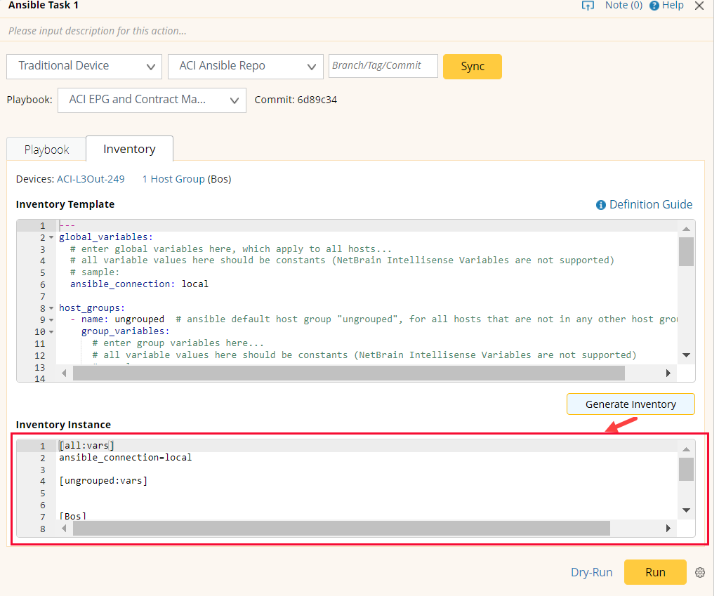 The inventory template is designed to generate bulk inventory instances (such as host groups). All contents in the Inventory Instance text field will be saved to an inventory file and run by the ansible-playbook command.