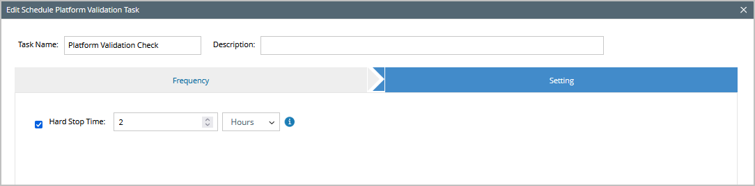 - Click the Platform Validation Check under the Task Name column to set the schedule and hard stop time of the PV task: