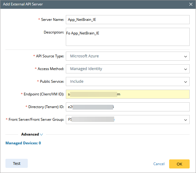 - Management Identity Client ID/Object ID/Resource ID: In the Advanced settings, you can specify which VM management identity will be used for NetworkBrain discovery.
