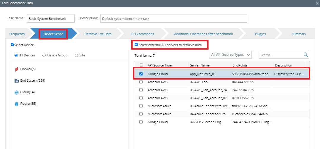 - On the Device Scope tab, check the Select external API servers to retrieve data check box and select the API server for GCP.