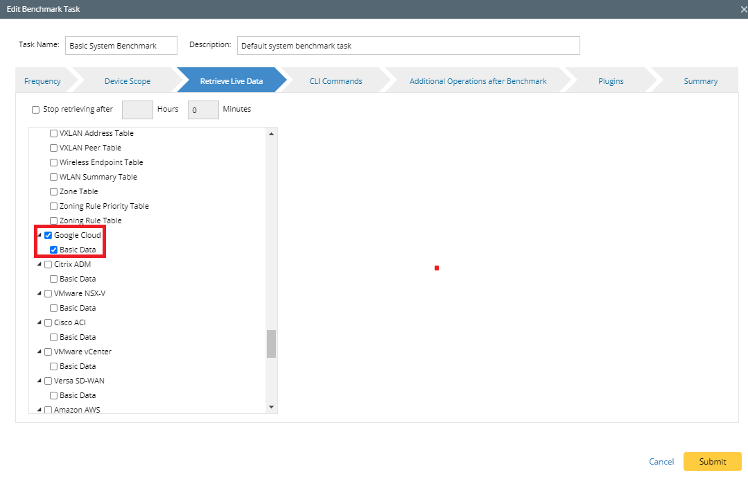 - On the Retrieve Live Data tab, select the Google Cloud Basic Data check box, keep the default selected GCP NCT tables as they are, and select BGP Advertised Route Table.