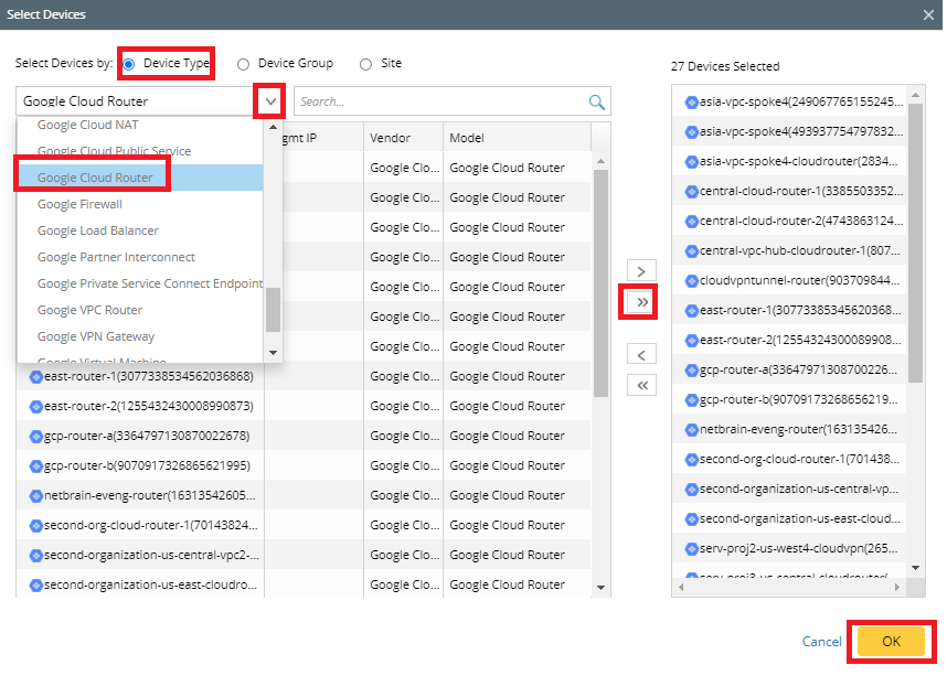 Note: Failure to exclude all the Google Cloud Router devices connected to MPLS may cause the path calculation issue. If you have any issue creating MPLS Cloud in the NetworkBrain System, contact NetBrain Support.