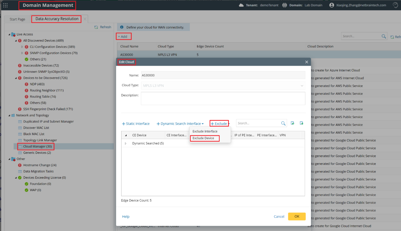 - Go to the Cloud Manager page from the Data Accuracy Resolution tab of the Domain Management page. Add your new MPLS or edit the existing one, and select Exclude Device.