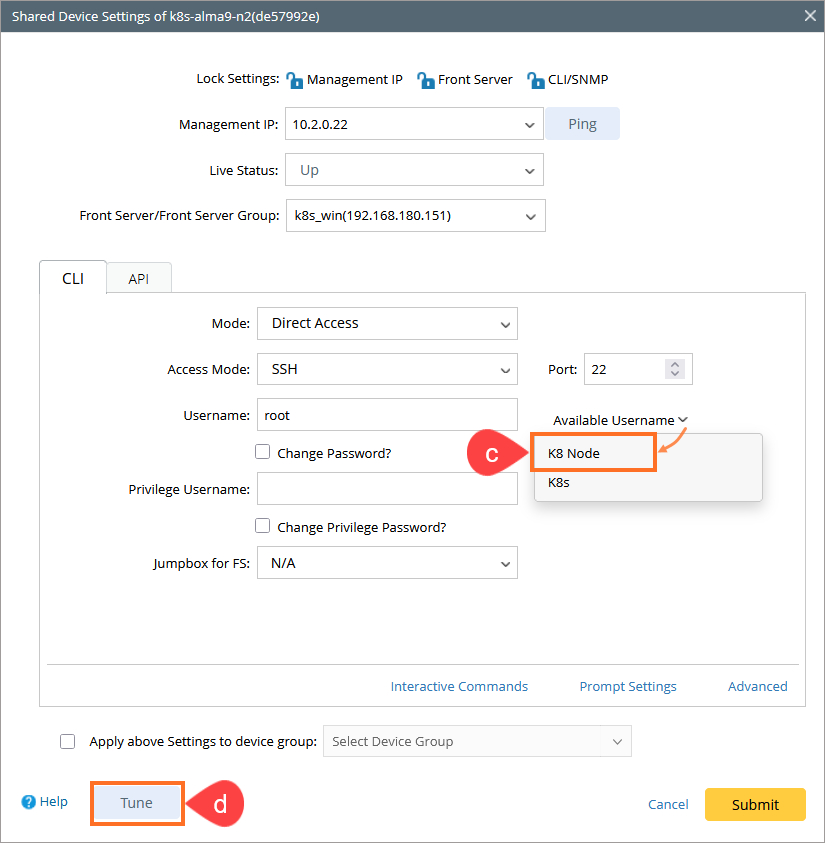 If CLI Connection is Successful, apply the same CLI settings to K8s Node device group.