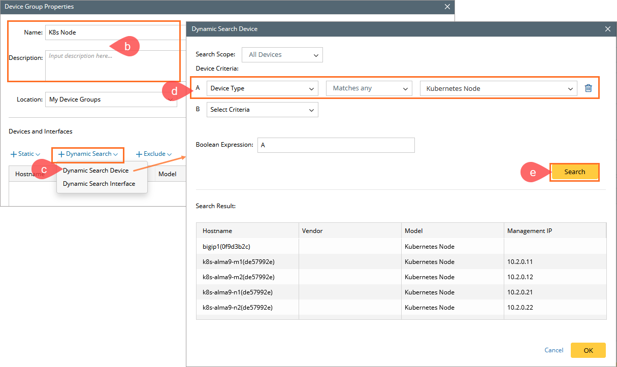 - Click Search to find the devices and then click OK to create a device group in the selected location.