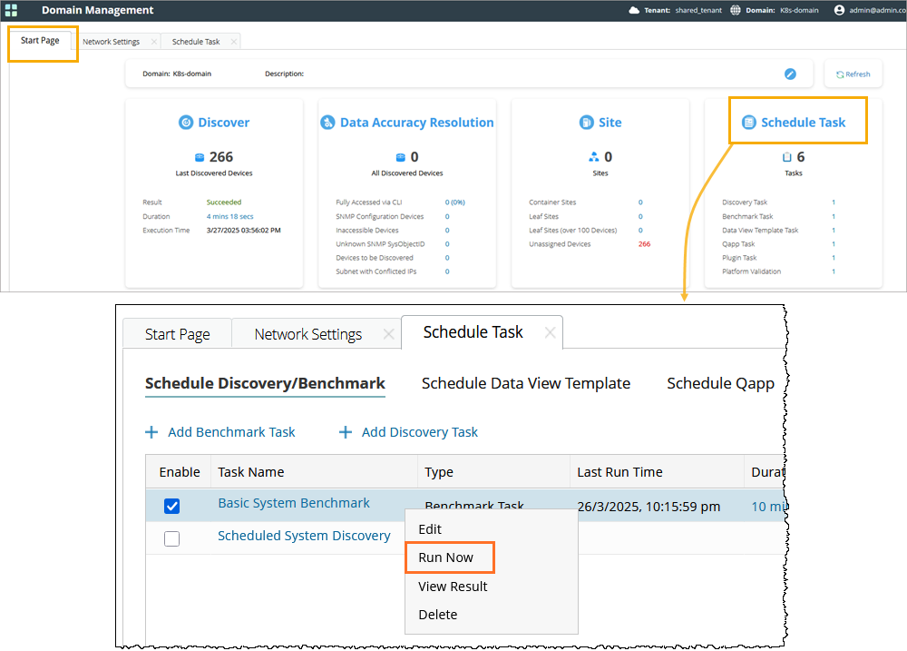 - Navigate to the Domain Management > Start Page and open the Schedule Task link.