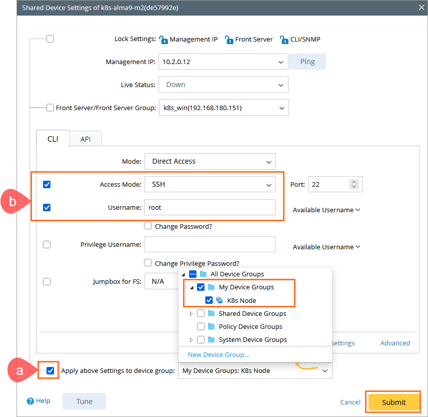Select the Apply Settings to device group checkbox and select the K8s Node Device Group from the dropdown that you have created in the step 1.