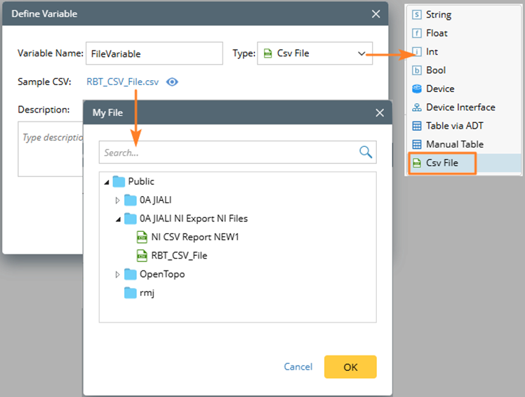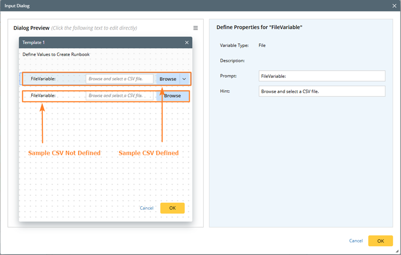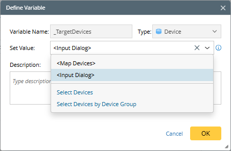 You can define the variable name and type, and set value for each type of template variable. The Input Dialog option controls whether the current variable value is user-defined or assigned through the input dialog. By default, this option is not selected. Once selected, the variable will appear in the input dialog and be assigned a value.
