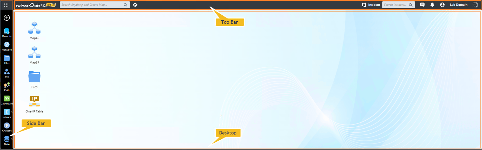 NetworkBrain main UI is displayed as soon as end users log in, which contains Side bar, Top bar, and Desktop.