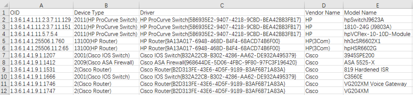 In summary, the Vendor Model list works as a local dictionary that associates the sysOID with Device Type and Device Driver.