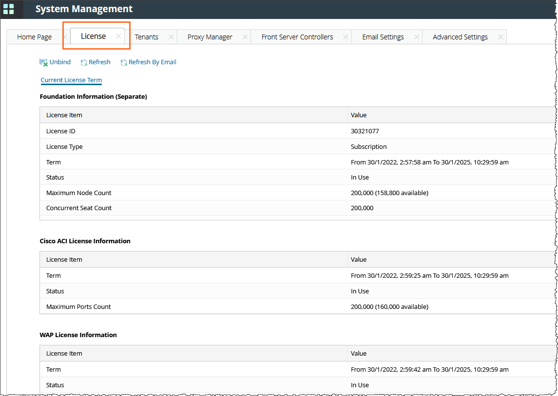 - To browse the license information, navigate to License, and check the license information under Current License Term. See License Information for more details.