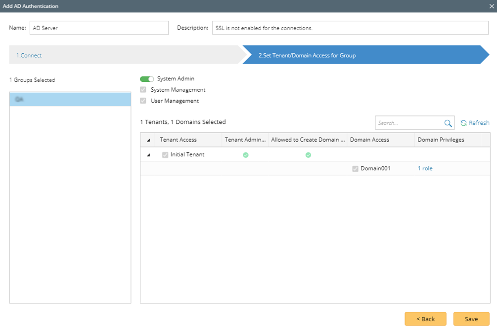 icon to remove an invalid group from the list. - Assign domain access and more privileges to the user accounts in the selected groups under the Set Tenant/Domain Access for Group tab.