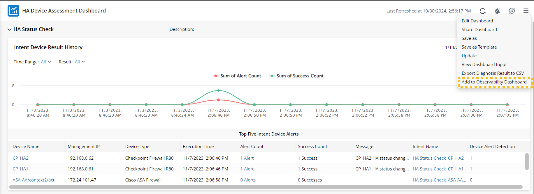 Alternatively, you can add the current intent dashboard to an existing or a new observability dashboard from the view mode as follows: