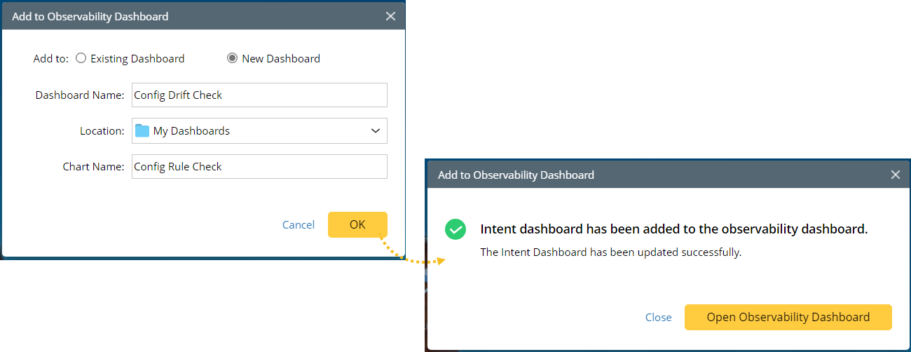 Creating an observability dashboard is smoother when you directly add the newly created intent dashboard to an observability dashboard. When you successfully create an intent dashboard, you will get the option to add it directly to an observability dashboard as follows: