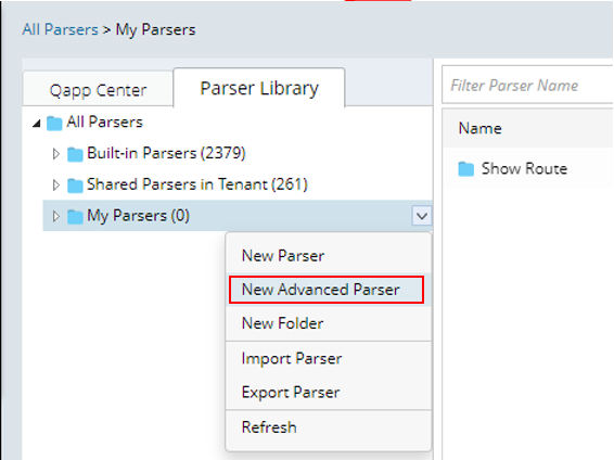 and select Parser Library. - Right-click My Parsers and select New Advanced Parser.