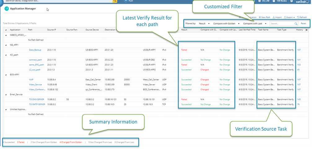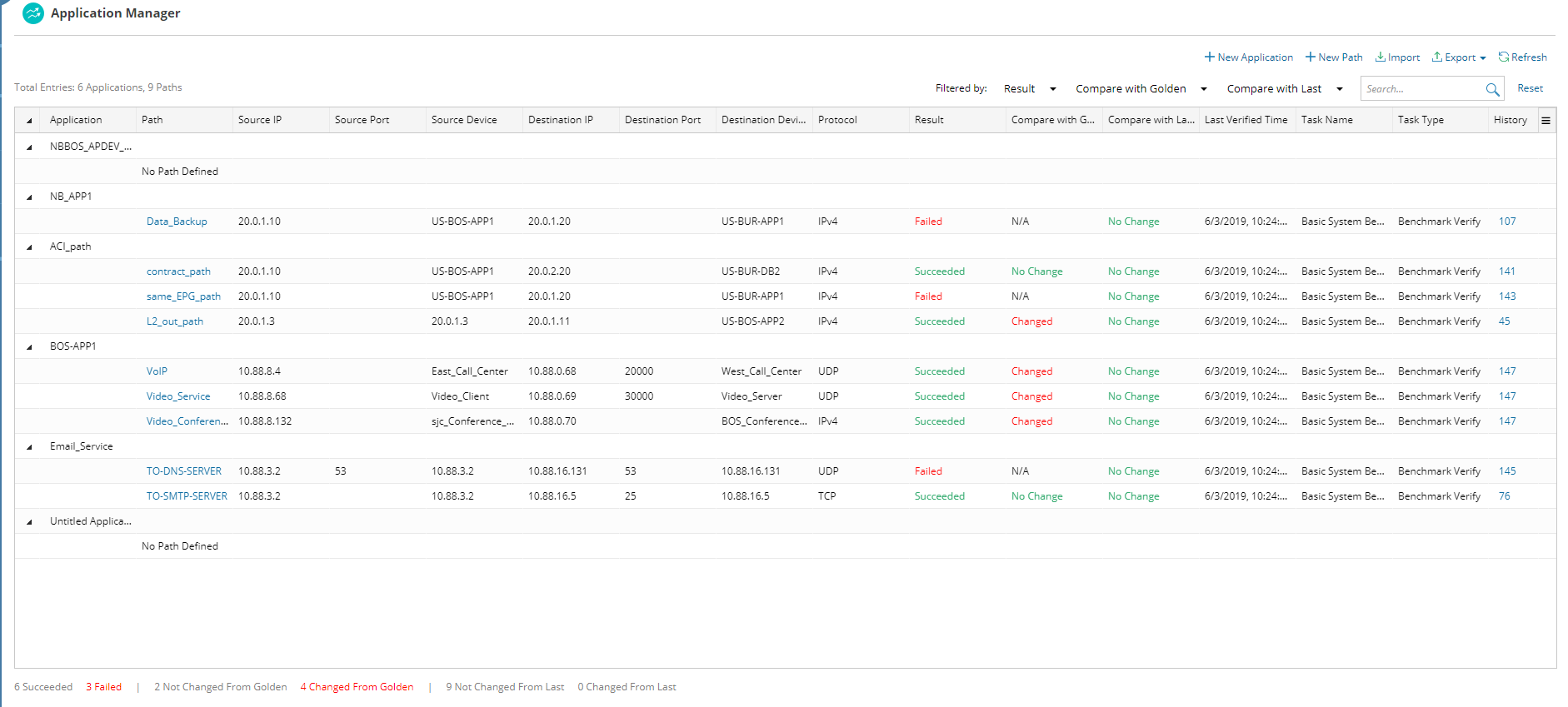 AAM can periodically monitor or verify the application paths and send alerts and emails when paths change. Application paths can be added to a benchmark task so it will be verified when the task is executed. Verification results can be viewed in Application Manager, exported to a CSV file or on a map depicting the differences between the current path and Golden Path.