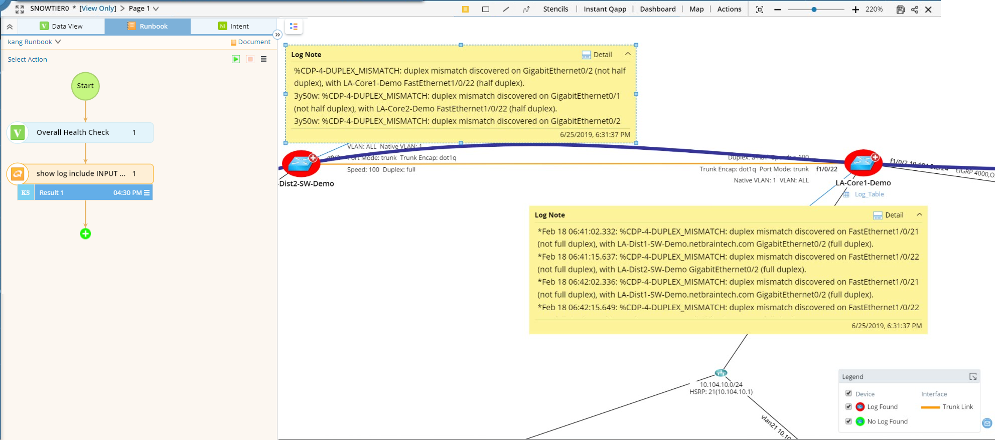 - View the running result to address the root cause of the alert. In this case, the alert is caused by a duplex mismatch.