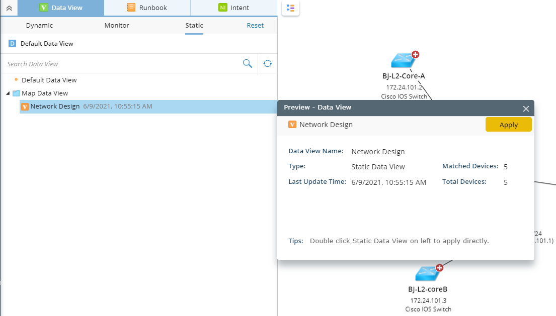 All devices on a map page are displayed in the default data view. You can apply a static data view to decode network design.