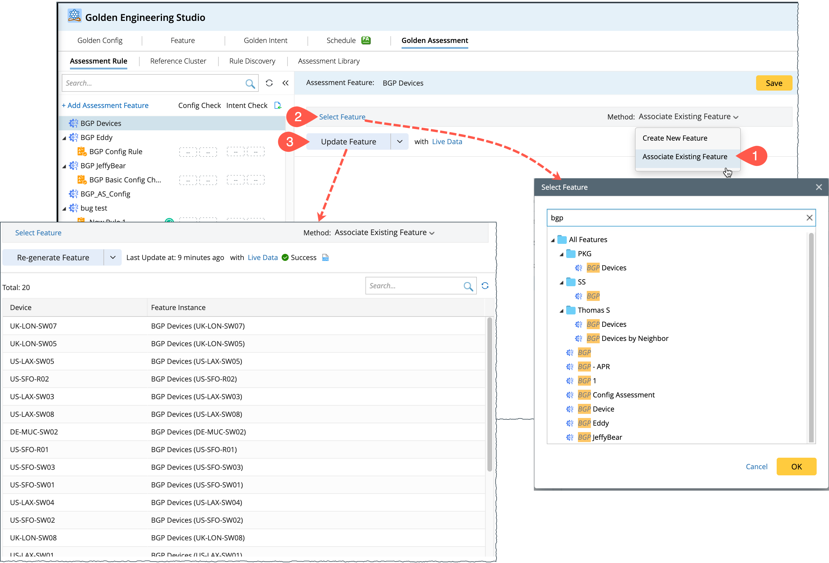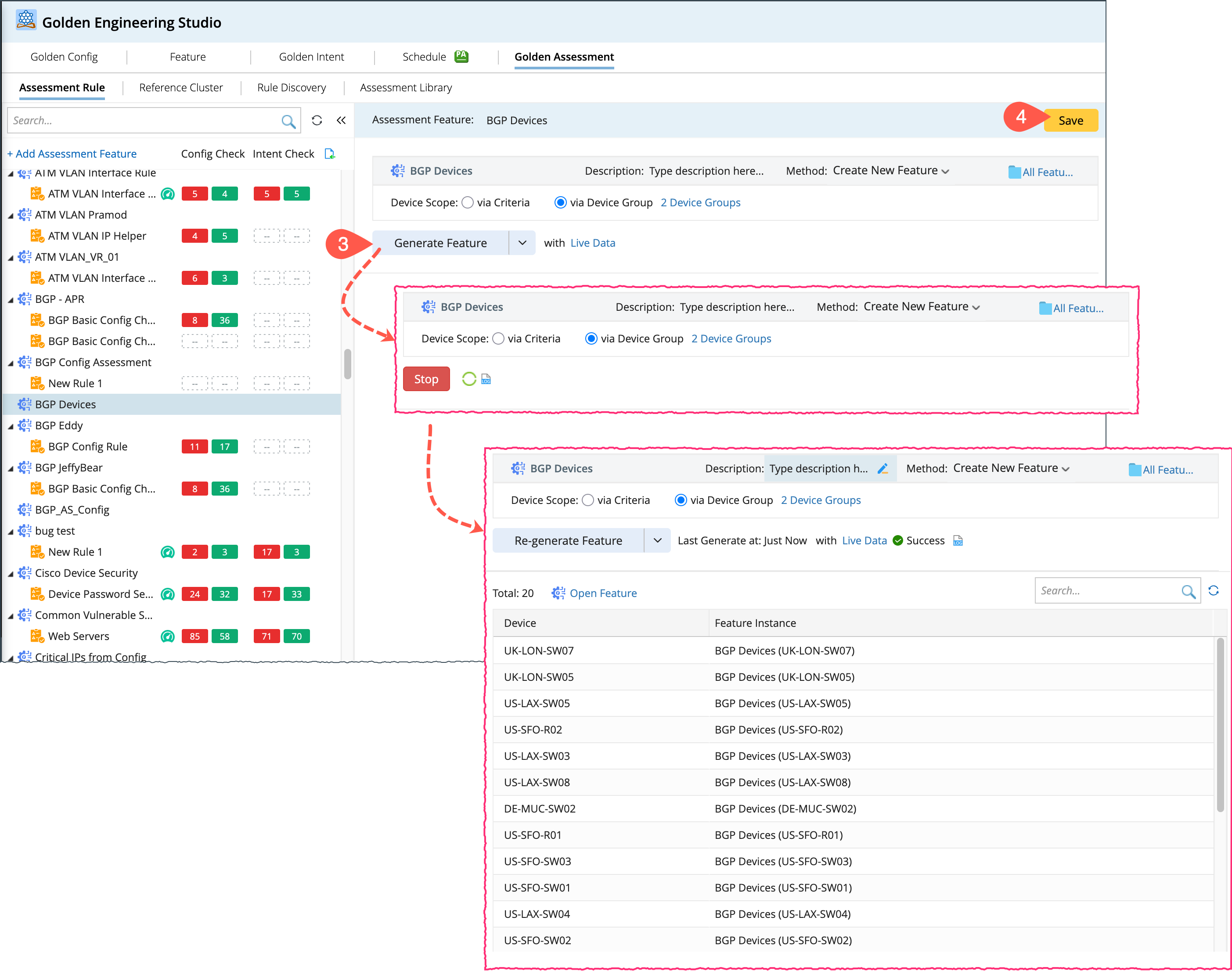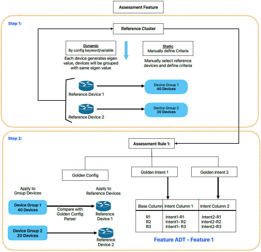 The Golden Assessment feature will enable users to define Golden Rules. You can compare the configuration of a set of devices with a reference device and view the results in the dashboard. In the Assessment Feature, you will create and associate the Reference Cluster and Assessment Rule with each other.