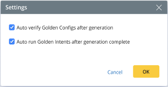 By default, both options are selected to execute the golden config and golden intent when Generation is completed. And the results will be available in the Results tab of the Assessment Rule. |