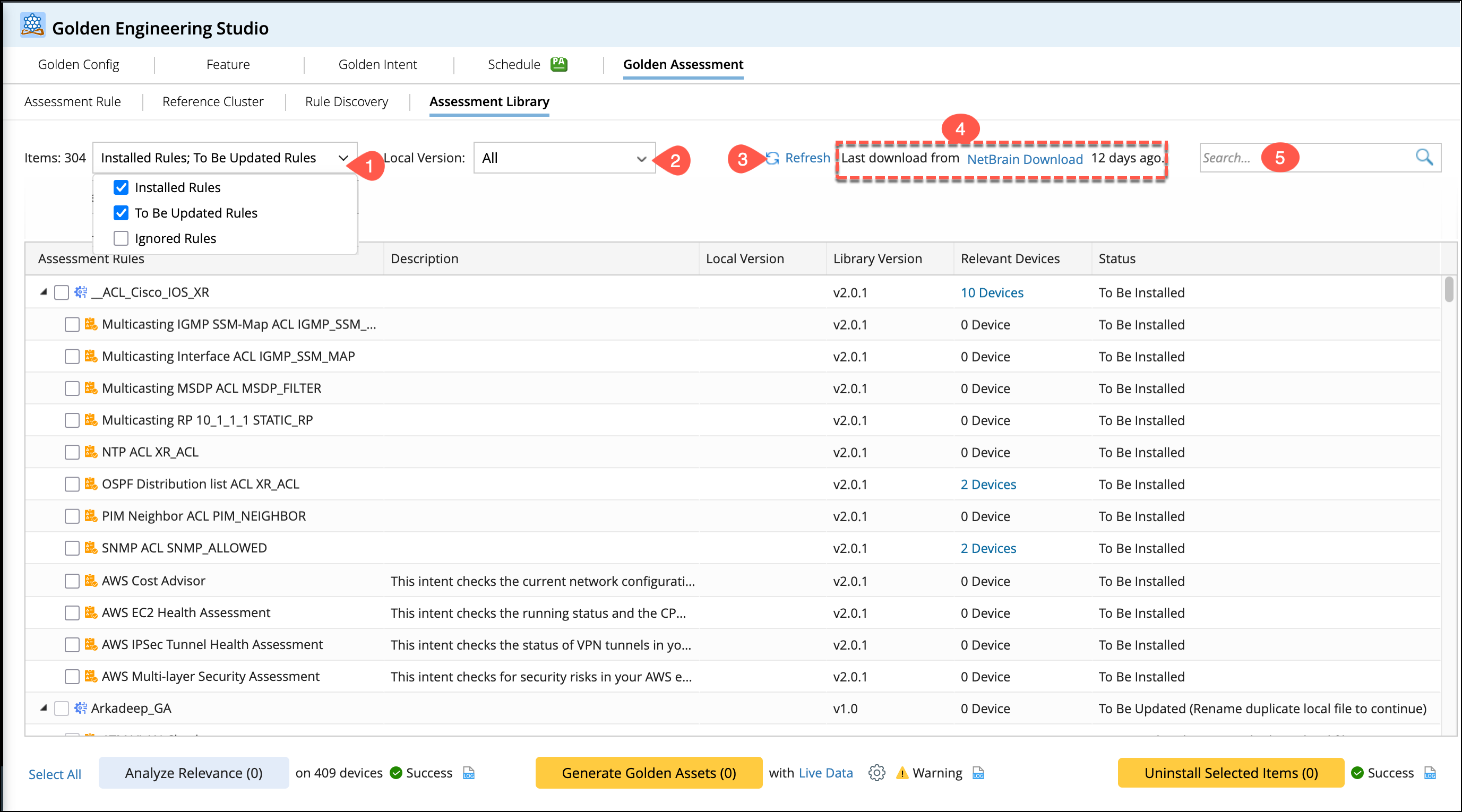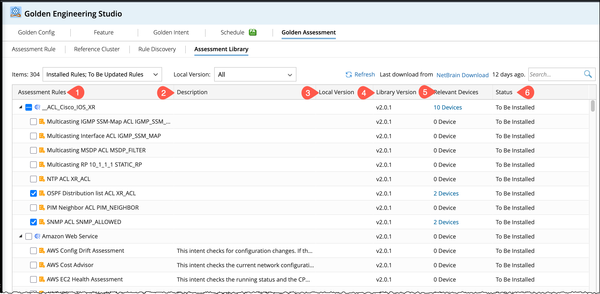 The Assessment Feature and Assessment Rule will be synchronized to the Assessment Library. You can download the Assessment Library via the NetBrain Download function. The downloaded resources include Reference Cluster, Assessment Feature, and Assessment Rule Definition, which are used for Golden Assessment. Power users can install and manage these resources through the Assessment Library interface. In this topic, you will explore: