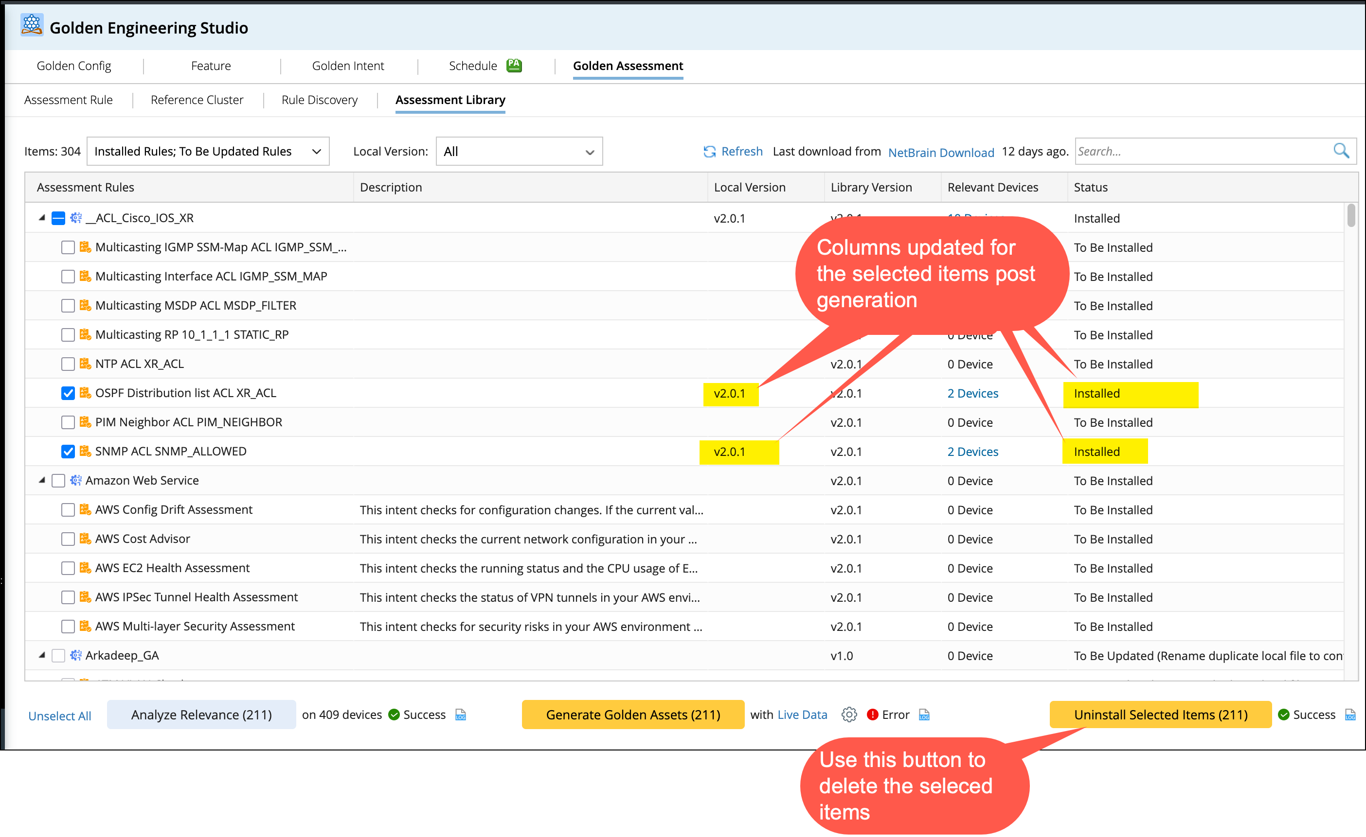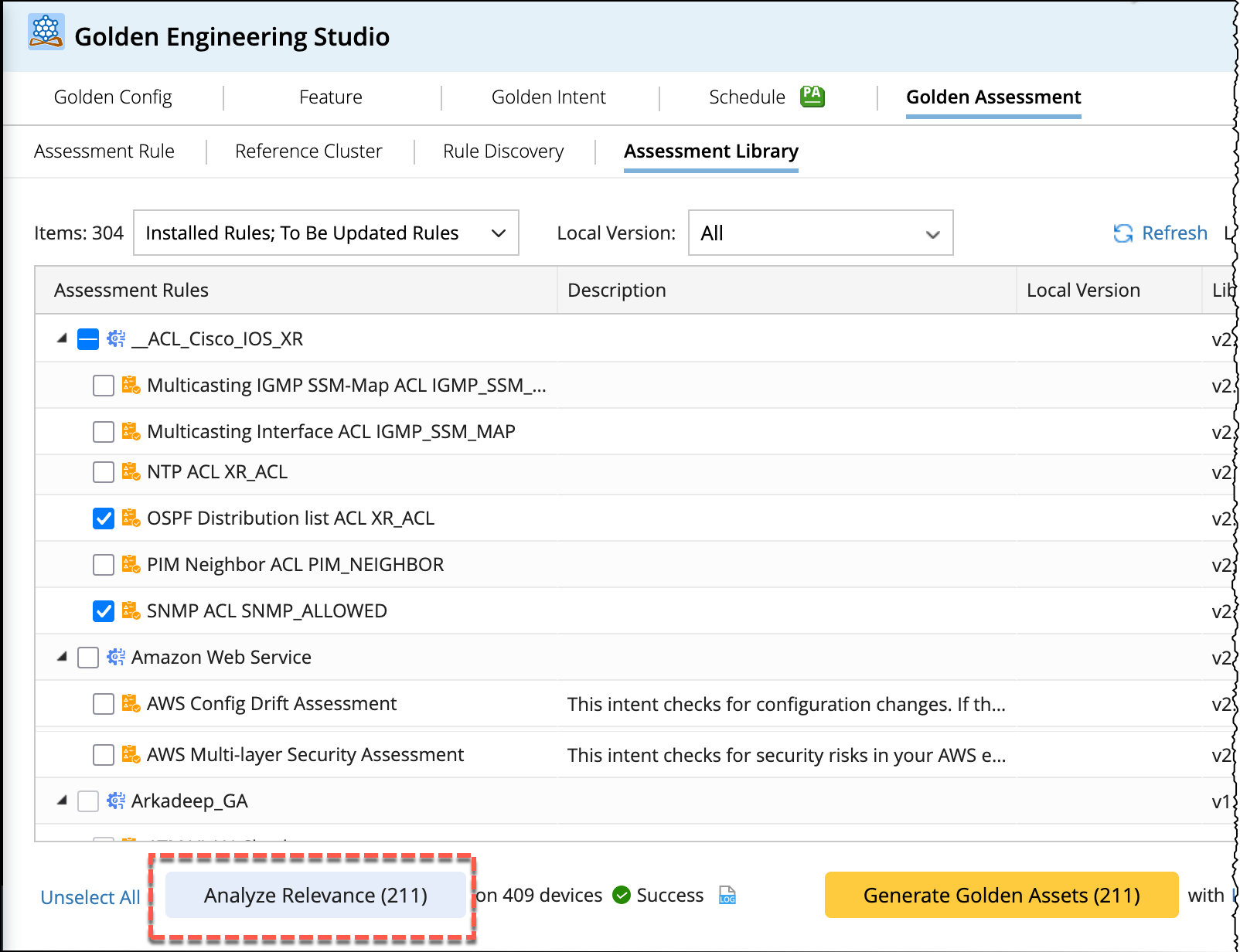 - The selected Assessment Features/Rules will be deleted from the corresponding Assessment Rule Tab, Golden Config/Intent/Golden Feature generated. There is no need to delete Reference Cluster as it remain constant.